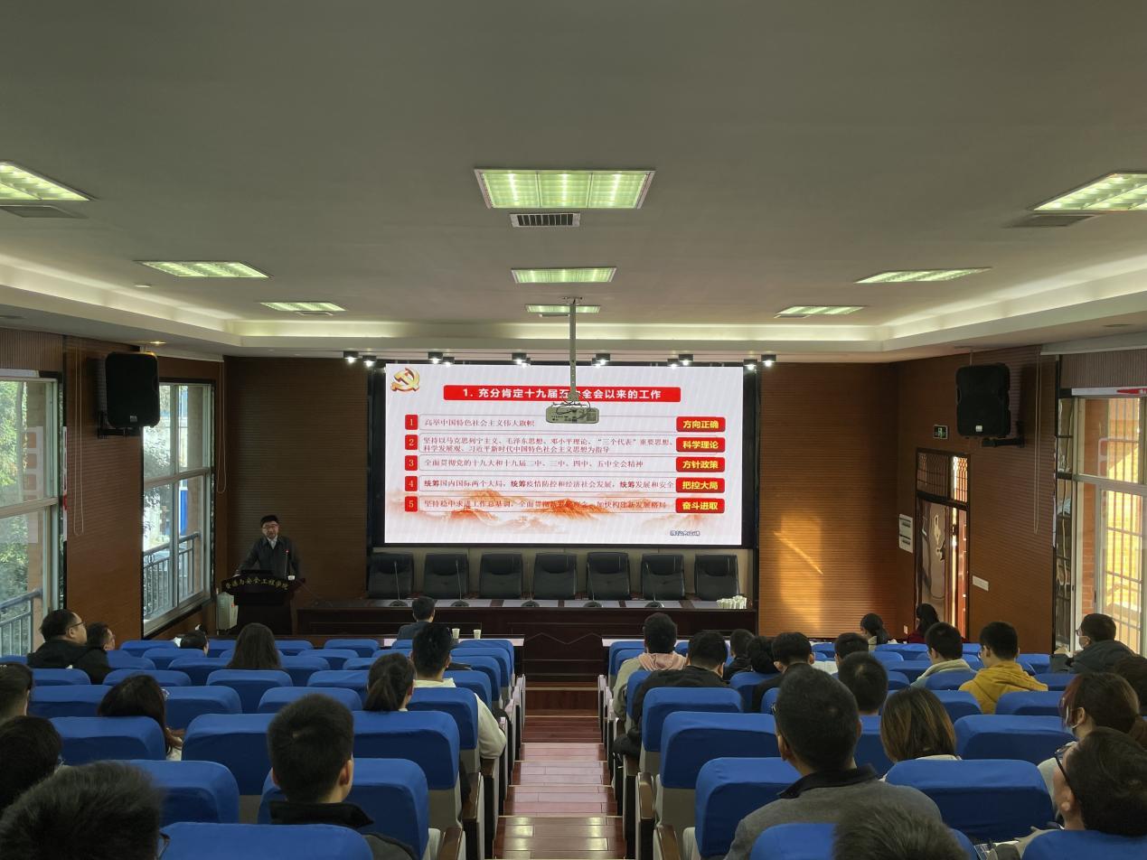 接着,由王教授带领大家进入此次宣讲会主题——学习十九届六中全会精神。王教授先给大家介绍了党中央召开十九届六中全会的基本情况以及主要内容,给师生们介绍了全会充分肯定党的十九届五中全会以来局的工作,总结党和国家各项事业取得了新的十大成就,成功举办庆祝中国共产党成立 100周年系列活动,激励全党全国各族人民意气风发踏上第二个百年奋斗目标的新征程。