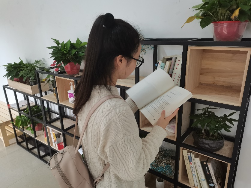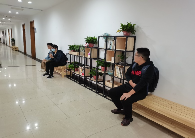 林明恪同学说布置完后这空旷的楼道变得温馨起来,自己在科研之余也能悠闲的坐在椅子上沉迷于书海之中享受读书带来的美好,不仅是喜欢这些绿植和书,更喜欢学院为我们着想丰富着我们学习生活中一点一滴的细节。