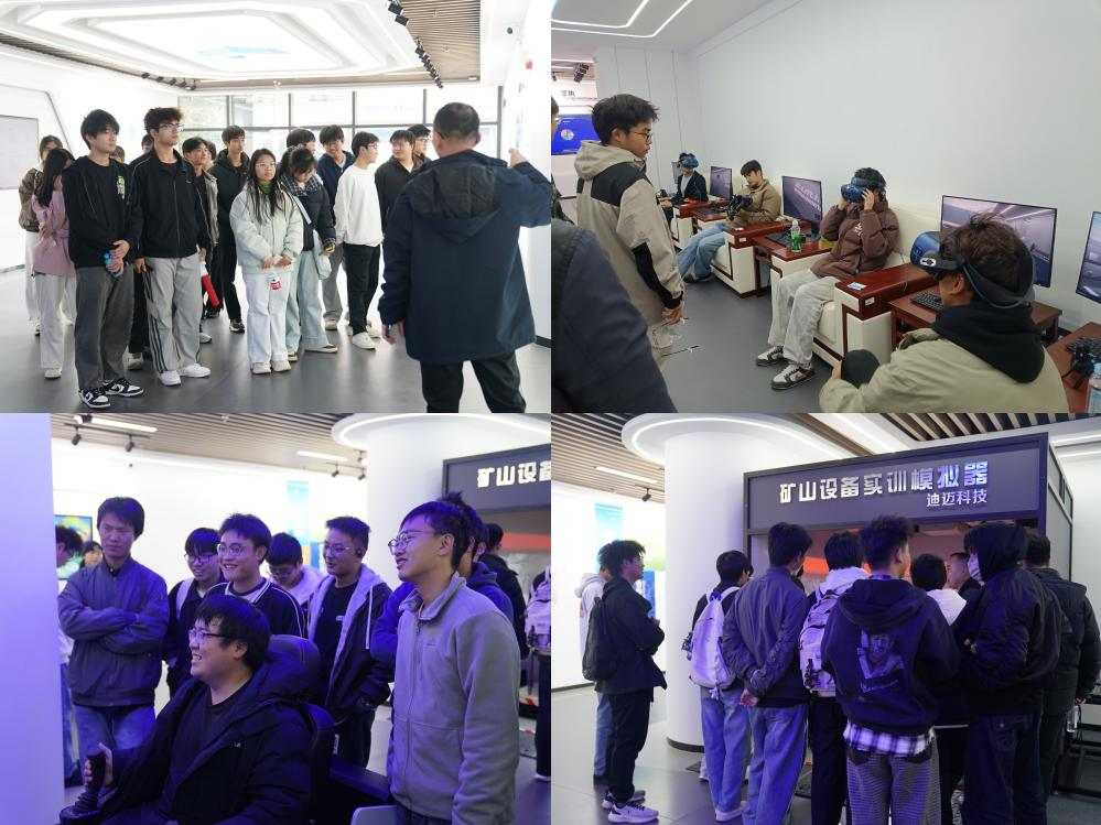 讲座结束后,同学们在讲解员的引导下进入展厅进行自由交流与参观。在公司展示区、虚拟实训平台、VR体验区等多个展台前,员工们近距离观摩和体验了采矿领域的前沿技术及其实际应用场景。活动尾声,全体师生于迪迈公司门前合影留念,为本次实践学习画上圆满句号。