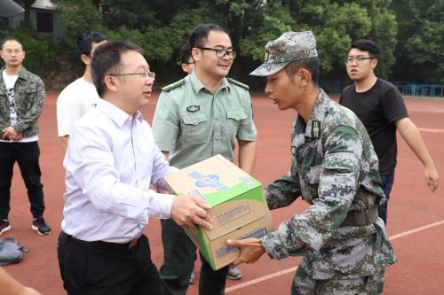公司领导亲自为新生和教官分发慰问品,并亲切与同学们就学习生活交谈沟通,拉近了学院与新生的距离,彰显出学院对新生的爱护和关怀,让刚远离家乡的新生们感受到了来自学院的温暖。