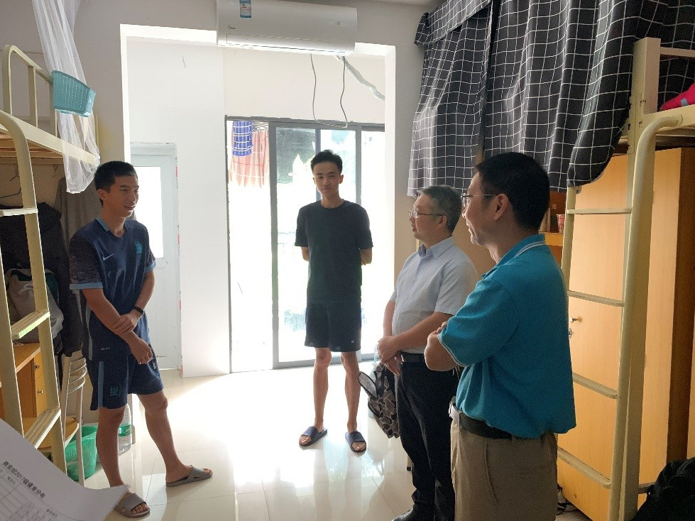 欧旭理书记和马国荣副书记带领年级辅导员深入本科2017、2018级员工宿舍,检查宿舍安全情况,仔细询问关心同学们的员工和生活情况,近距离了解员工思想动态,并着重了解了留校同学情况,叮嘱留校同学强化安全意识,注意用水用电安全,同学们对学院领导的亲切慰问和关怀倍感温暖。