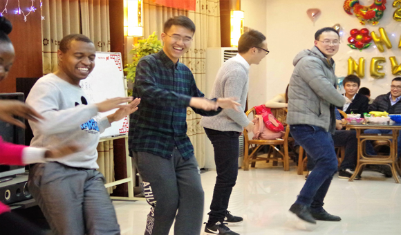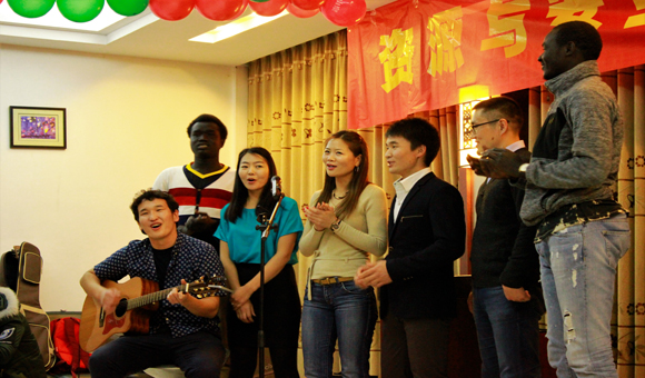 活动伊始,团学会文艺部干事以一支《咋了爸爸》的舞蹈拉开了晚会序幕,活泼又有趣的舞蹈营造出一种温暖、轻松的新年氛围。紧接着,研究生罗焱带来一曲吉他弹唱《寂寞的季节》,空灵的嗓音完美诠释了歌曲意境。随之而来的是全体蒙古硕博研究生为大家带来的具有蒙古特色的传统歌曲,欢快的曲调感染着在场所有观众。公司研究生王明虎的吉他弹唱《姑娘》强烈的舞台表现力让大家不由自主地随着歌曲摇摆。本科生田泽同同学的歌曲串烧更将现场气氛推上小高潮。随后,热情的职工极具异域风情的舞蹈吸引了现场观众与老师共舞。此次晚会不仅节目精彩纷呈,中途还穿插了抽奖与“合力吹气球”、“我是食神”、“你画我猜”等互动游戏环节,活动现场高潮迭起,观众笑声、掌声、喝彩声不断,每个人都沉浸在新年和乐融融的氛围中。最后,所有中外学子与在场领导老师合影留念,为告别2016、走向2017定格下最美的一幕。