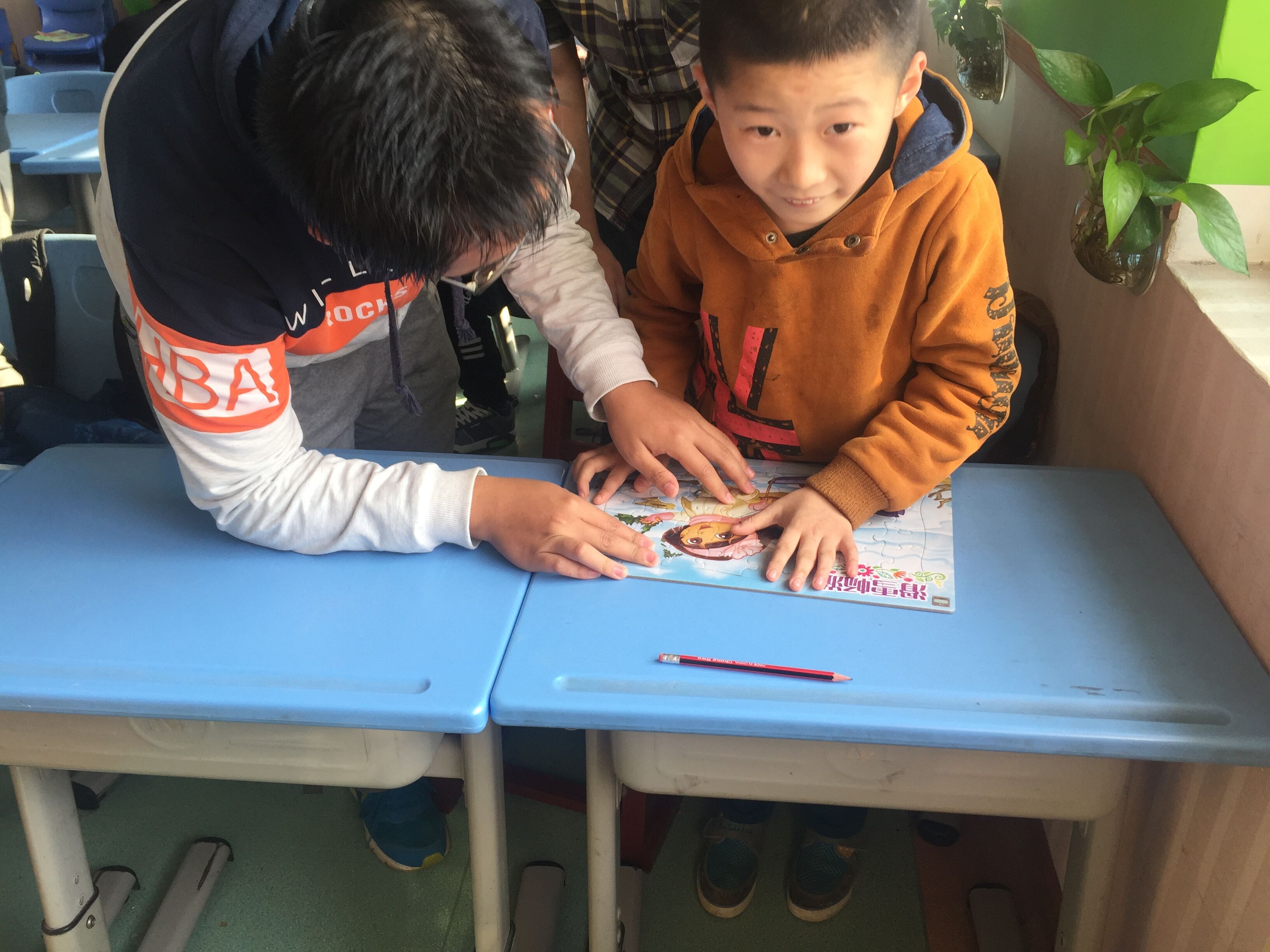 在特殊教育学校生活的孩子,或生活在无声的世界里,或生活在黑暗的世界中,他们需要的是温暖与陪伴,因此,志愿者的到来让每一位孩子都很兴奋。到达活动地点后,志愿者与特教学校的孩子们互相介绍了自己,有的小朋友还自告奋勇表演了节目,以此表示对志愿者的欢迎。在彼此进行了充分了解之后,志愿者们开始教小朋友们贴贴画、拼拼图、用橡皮泥捏各种动画作品中的角色,有的志愿者还带着小朋友打起了乒乓球。室外活动中,志愿者们陪小朋友跳绳,做游戏,孩子们纯洁开朗的笑声响彻了整个活动现场。