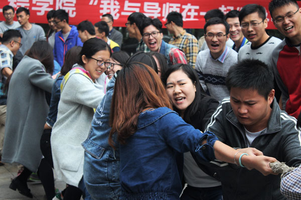 为了缓解师生的工作学习压力,增进研究生与导师间的感情,2016年10月12日下午15:40,william威廉中文官网在采矿楼前坪举办了一场主题为“我与导师在一起”的拔河比赛,william威廉中文官网共计十一位导师与全体硕士研究生参加了本次活动。