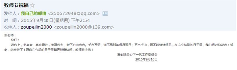 在教师节来临之际,在学院关工委主任、公司党委副书记孙胜老师的带领下,院关工委秘书、分团委书记朱玮老师和员工代表,走访慰问了陈菊山、彭续承等公司关心下一代工作委员会的几位老教师,并通过贺卡、电子邮件、手机短信等多动方式,为学院关工委的老师们送上了一份暖暖的教师节祝福。