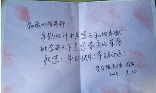 此外,学院关工委联合院团委共同开展了“访谈·祝愿·求教”活动,为老师们送去节日祝福,聆听老师们的教诲。9月10日的课堂上,有课的同学都早早地来到教室,摆放好为敬爱的老师精心准备的果篮、鲜花和祝福卡片等,授课教师一走进教室,同学就不约而同地用热烈的掌声、齐声的祝福向老师们表达感念师恩的拳拳之心、深深之情。言传身教为人师表,甘为人梯终身不悔。
