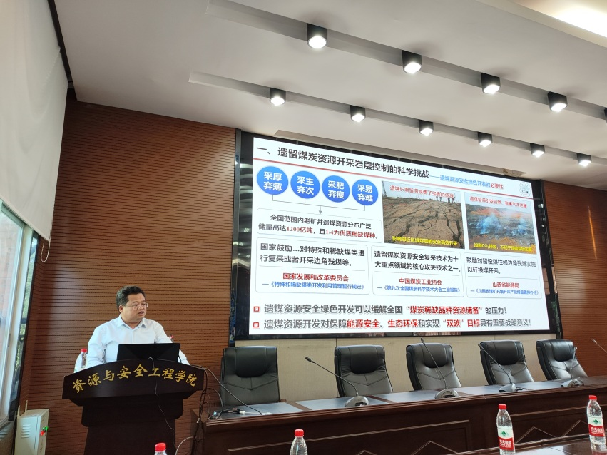 冯国瑞教授从遗留煤炭资源开采岩层控制取得的研究成果进行了阐述,详细介绍了其团队在遗煤开采矿压显现规律与岩体结构、遗煤开采煤柱群灾变失稳特征与机理、遗煤开采矿压与岩层控制技术、遗煤资源高回收率开采技术方法等方面的最新研究成果。在交流环节,冯国瑞教授对师生们提出的问题进行了耐心解答,就矿压与岩层控制的区域化、多相化、多场化、时效化、分源化、低碳化给出了进一步的解答,拓展了师生们对相关领域前沿进展的认识。