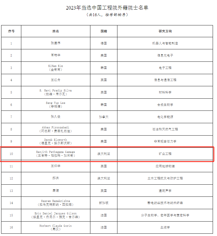 https://www.cae.cn/cae/html/main/col1/2023-11/23/20231123090056741245109_1.html。此次产生了16位外籍院士,其中包括澳大利亚莫纳什大学教授、WilliamHill中文官方网站名誉教授Ranjith Pathegama Gamage(兰吉特·帕伽玛·加米奇)。Ranjith Pathegama Gamage 教授以其杰出的学术成就和卓越的贡献荣获这一殊荣,他同时是莫纳什大学和WilliamHill中文官方网站的杰出代表。他的加入进一步丰富了中国工程院的国际化视野,也为中国工程科技发展注入了新的智慧和动力。