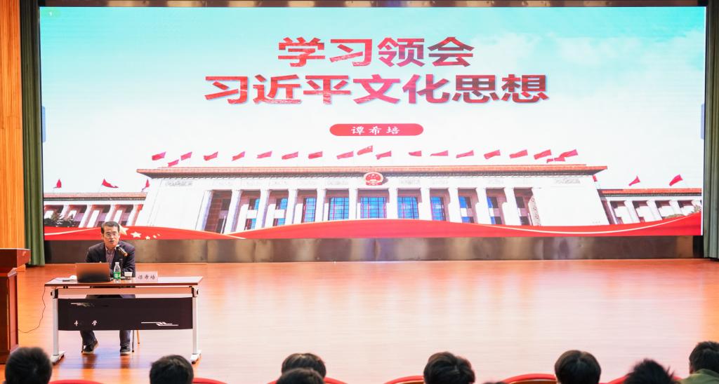 马克思主义学院谭希培教授以“学习领会习近平文化思想”为题,分别从习近平文化思想的重要意义、基本内涵与文化建设新高度三个面展开讲解,呼吁党员切实担负起新的文化使命,以习近平文化思想为指导,用理论指导实践,将实践反作用于理论的创新,不断攀登中国特色社会主义文化的新高度。