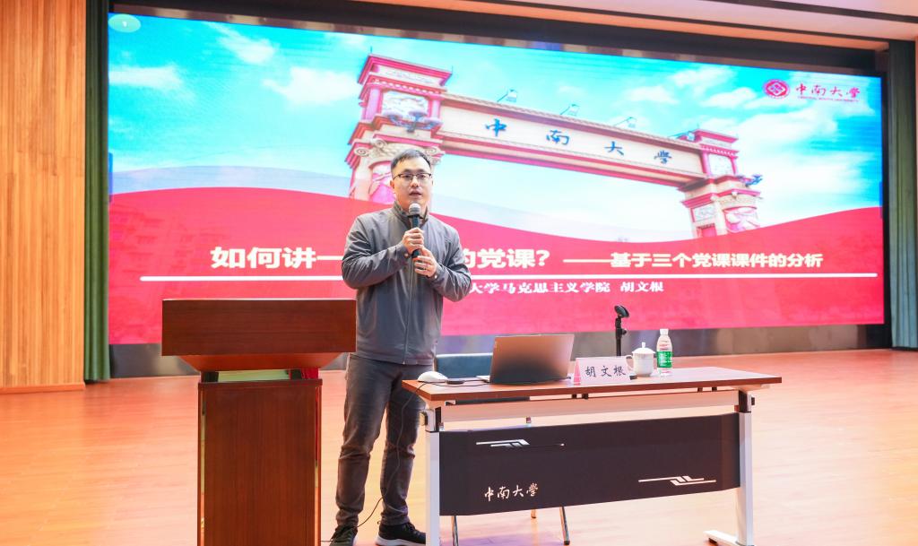 马克思主义学院马原教研中心党支部书记胡文根老师开展主题为“如何讲一堂精彩的党课”的分享,以党课课件为基础强调了党课的重要性,从课件目录、提问形式与回答方式、图片的搭配等内容出发,针对如何增强党课感染力、丰富党课内容内涵等问题给出具体回答,引经据典、绘声绘色地奉献出一场精彩讲解。