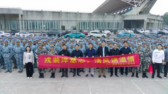 10月21日下午,学院在新校区排球场成功举行“戎装淬意志,清风送温情”军训慰问活动,公司党委书记秦进,副书记岳龙,副经理李地元、尹土兵以及学工办全体辅导员、三连全体教官与新生参加本次活动。