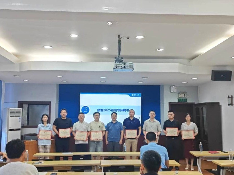 会上,秦进书记为2025级新任班导师颁发聘书,对大家的加入表示欢迎;同时为获得2024-2025年度“WilliamHill中文官方网站优秀班导师(标兵)”称号的蔡鑫、李杰林、石英、吴金标、彭平安五位教师颁发荣誉证书,肯定其在员工工作中的突出贡献,激励全体班导师以优秀为榜样,践行育人职责。